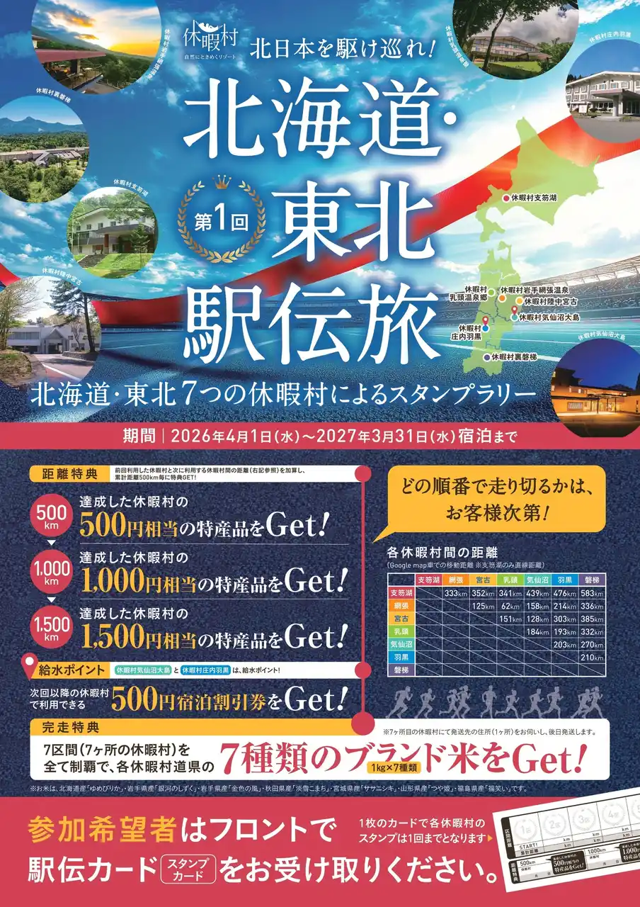 各休暇村間の距離を“走破距離”として積み上げながら巡る体験型周遊企画で、累計距離や宿泊利用に応じて各地の特産品や割引券などの特典を用意しています。 |