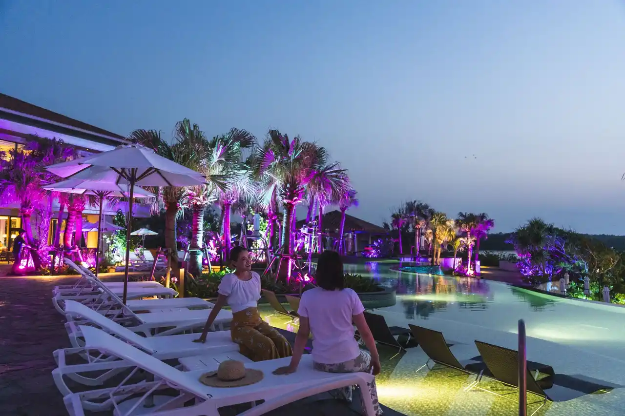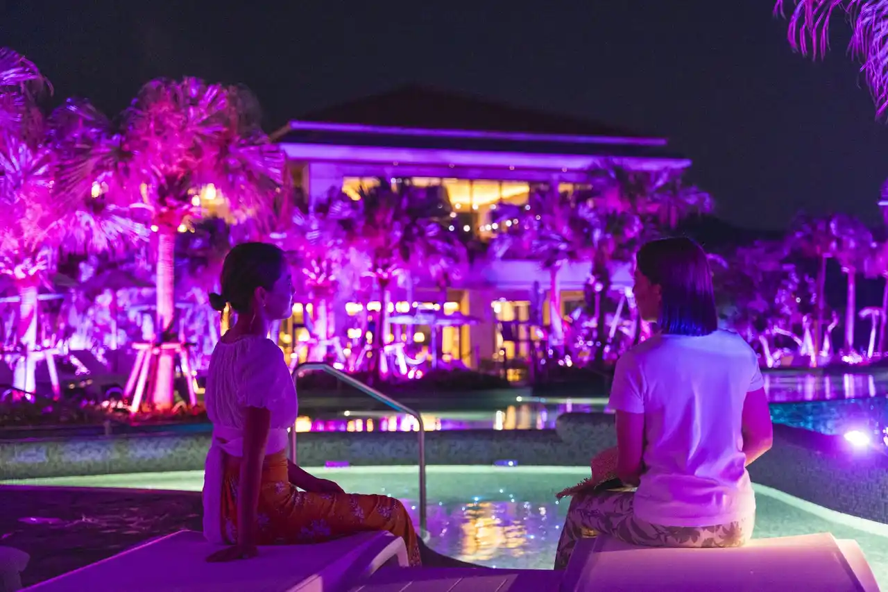 沖縄の海と空がゆっくり夜へと染まる時間帯に、沖縄の城をイメージした独特の石壁と美しい海の景色を持つグスクプールや沖縄でも数少ない常に海水が循環しているインフィニティプール、ラグーンが幻想的なギャラクシーピンクに包まれる「瀬良垣ナイトプール」。まるで海と一体になったような感覚を味わえる、瀬良垣島ならではのロケーションが際立つ、唯一無二のアイランドナイトプールで、島ならではの特別なリゾートナイトをご体験いただけます。 |