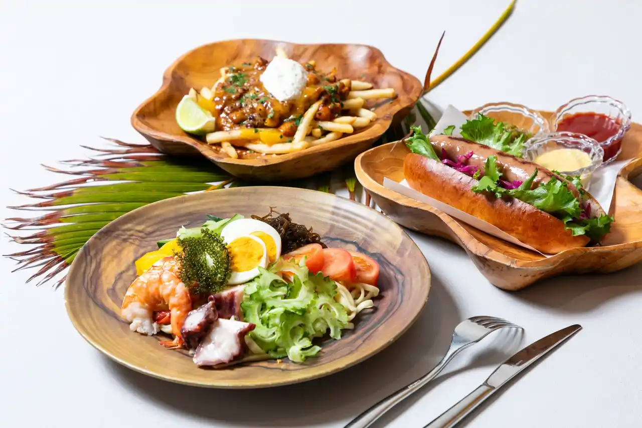 夜のプールサイドを彩るのは、イベントだけではありません。グスクプール横に営業するプールサイドバーでは、海の幸をはじめゴーヤ、もずくなど沖縄食材をたっぷり使った「海鮮冷やし沖縄そば」、沖縄県産黒糖使用のホワイトラム「ティーダラム」を使い、瀬良垣島が美しいサンセットに包まれる様子を表現した「マジックモヒート瀬良垣」、香り高い甘さが特徴のノンアルコールカクテル「パッションラグーン」など、南国らしい心躍るメニューが揃います。 |