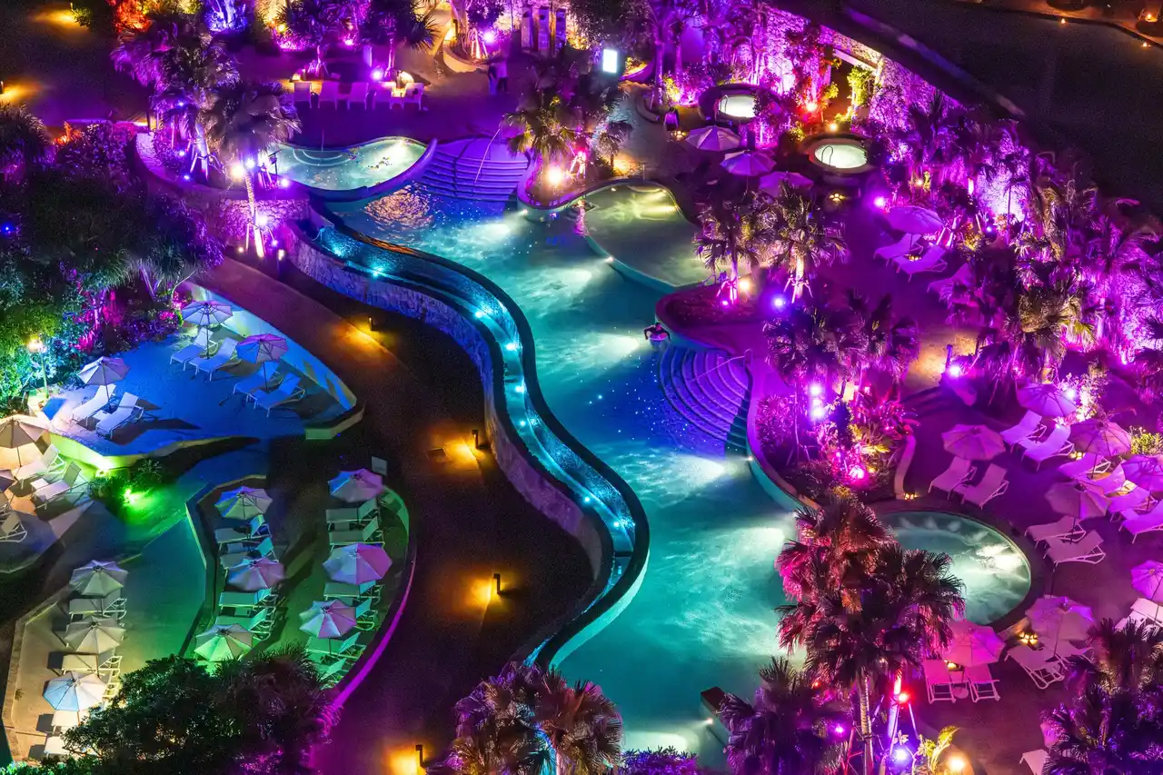 今年の瀬良垣ナイトプールのキーワードは「笑顔弾けるナイトプール」。舞台となるのは、琉球王国の城(グスク)壁をモチーフとした曲線美が美しい、グスクプール。幻想的なギャラクシーピンクに彩られたプールは、昼とはひと味違う夜だけの特別な空気をまとい、夜の優しい風、キラキラと光る水面、映画のシーンのように空間を包み込むDJサウンドが体と心を解きほぐし、高揚感と笑顔をお届けします。 |