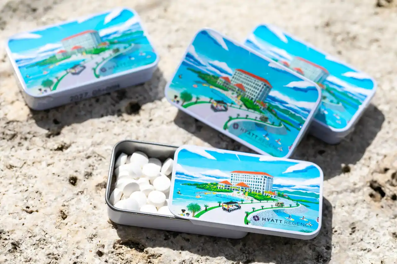 旅の記憶を形にする新作のホテルオリジナルアイテムも登場します。瀬良垣島へと渡る橋を颯爽と走り抜けるカートや青い海に囲まれたリゾートホテルをモチーフにしたイラストが印象的な「ミント缶」は、旅の合間のリフレッシュはもちろん、大切な方へのプチギフトとしても最適です。 |