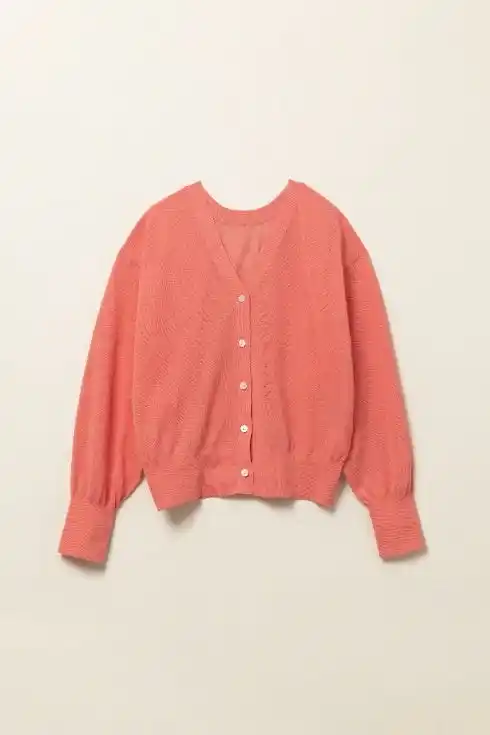 程よいシアー感と張り感のある素材が魅力のカーディガン。 首まわりをきれいに見せるVネックが、女性らしく上品な印象を引き立てます。 着回しが利く前後2WAYデザインで、クルーネックニットとしても活躍する一着です。 |