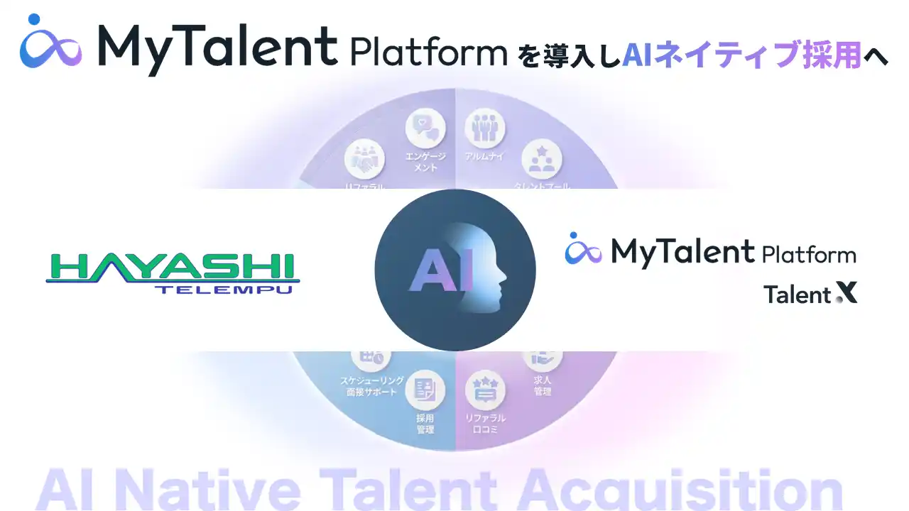 株式会社TalentX(本社:東京都新宿区、代表取締役社長 CEO:鈴木 貴史、証券コード:330A、以下「当社」)は、統合型タレントアクイジションプラットフォーム「MyTalent Platform」内のAIネイティブ採用CRM「MyTalent CRM」、リファラル採用プラットフォーム「MyTalent Refer(MyRefer)」が林テレンプ株式会社(以下「林テレンプ」)に導入されたことをお知らせいたします。 |