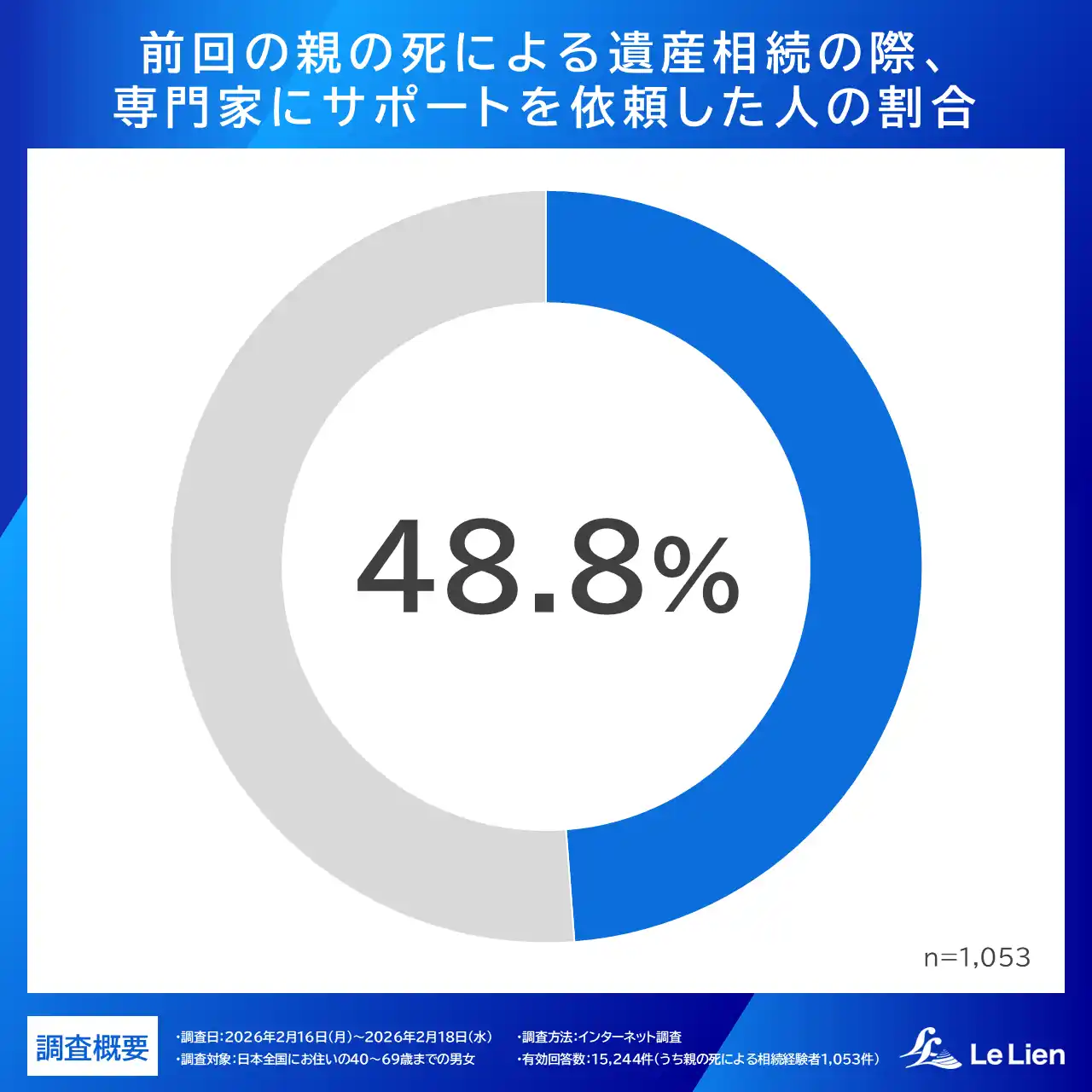 前回の親の死による遺産相続時、専門家にサポートを依頼した人の割合は48.8%と、約半数にのぼります。 |
