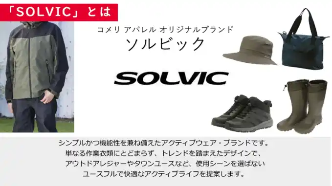 シンプルかつ機能性を兼ね備えたカジュアルギア・ブランドの「SOLVIC(ソルビック)」。トレンドを踏まえたデザインで、ガーデニングやアウトドアレジャー、タウンユースなど、使用シーンを選ばない快適なアクティブライフを提案しています。 |