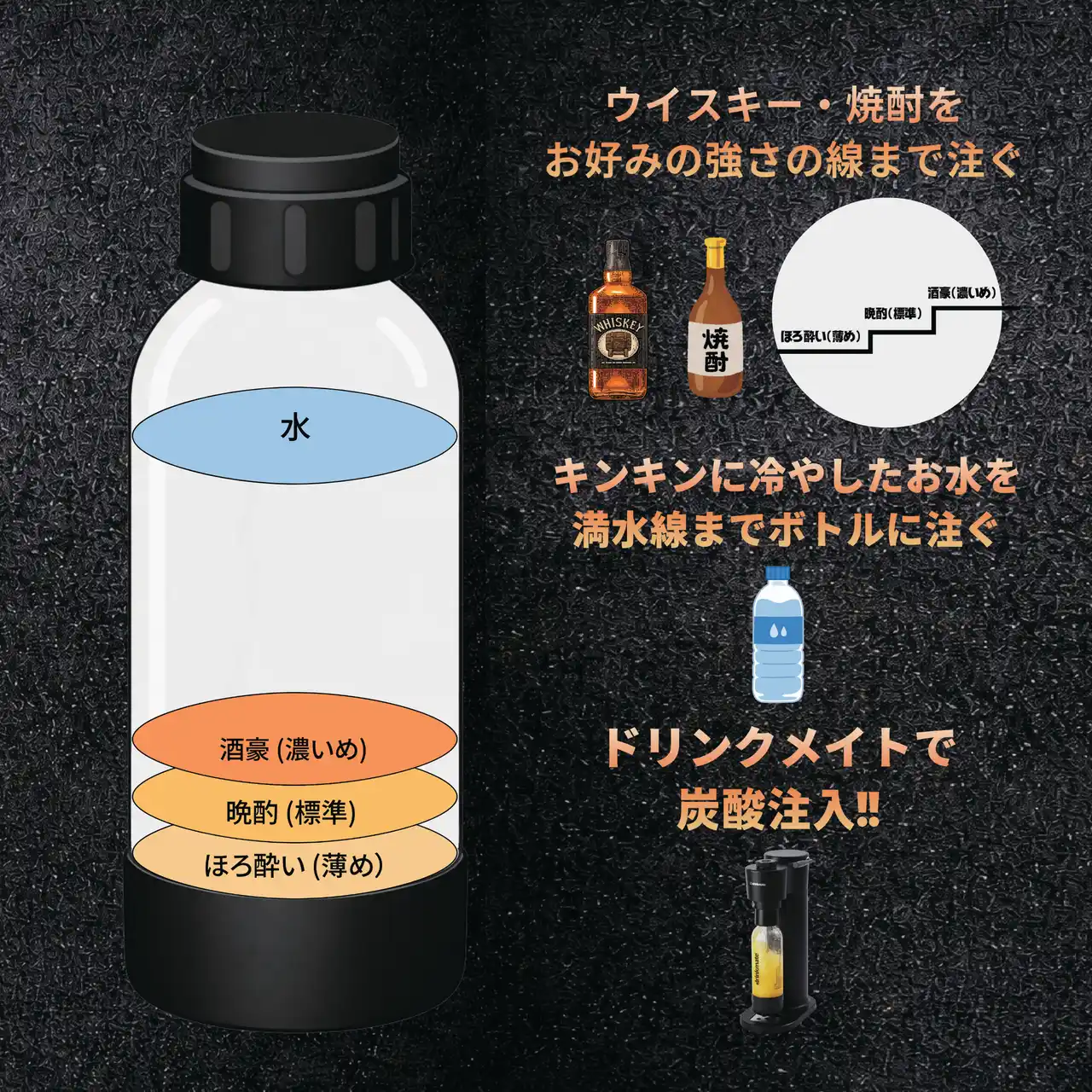 ■先割の水割りを作っておけばそのまま直接炭酸注入!! ■バチバチの強炭酸ハイボールが楽しめる。 ■飲み残しても、翌日に炭酸を再注入すると、”復活ハイボール”!! |