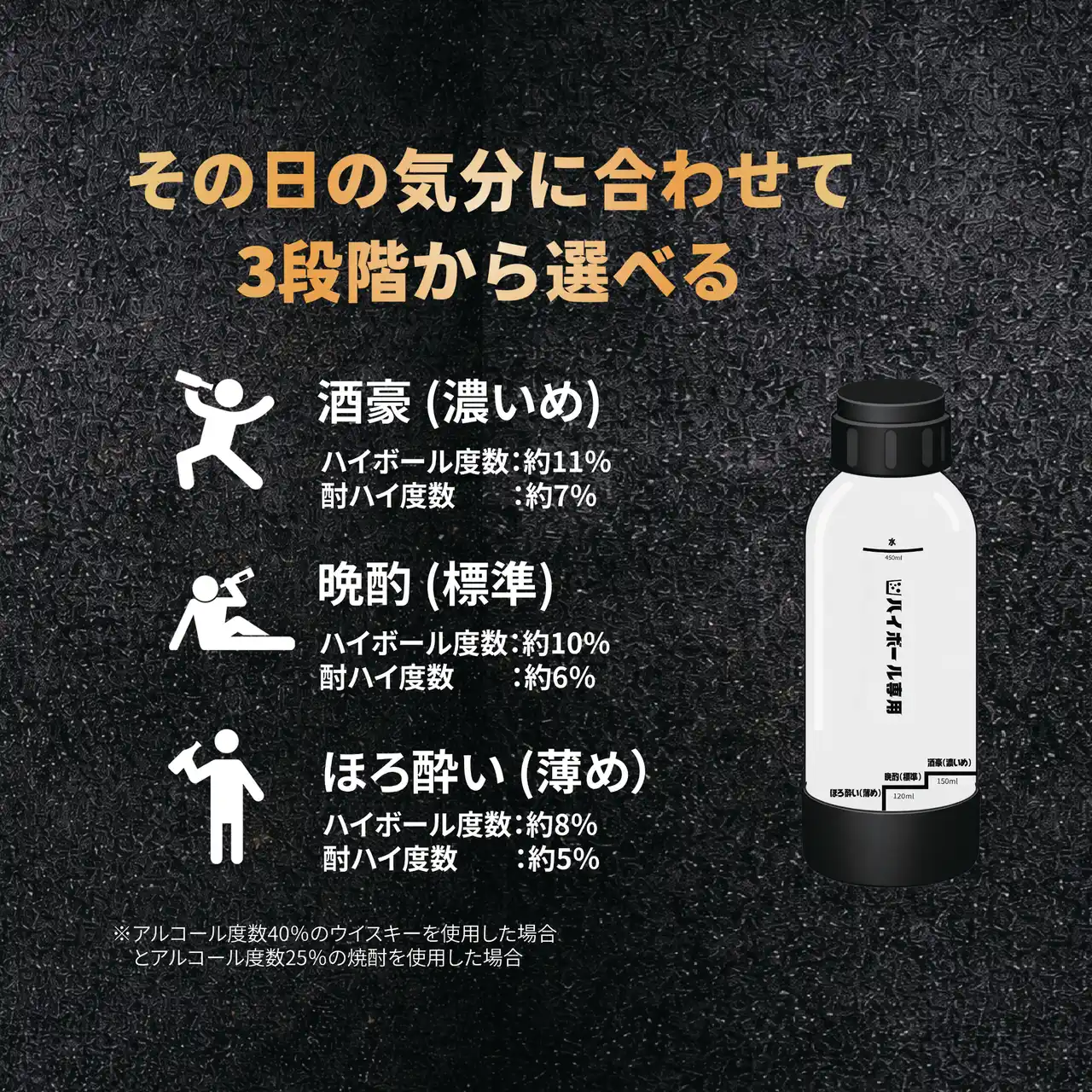 | ほろ酔い・晩酌・酒豪の3段階でその日の気分に合わせて飲料の濃さを調節可能 | |||||||||