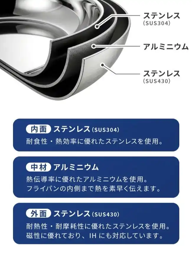本製品は「手入れが簡単で、美味しく仕上がり、長く使える」ことを追求したフライパンです。 熱伝導に優れた「アルミクラッド3層鋼」を採用し、アルミをステンレスで挟んだ構造により、食材へ均一に熱を伝えます。ステーキもムラなく、ふっくらジューシーに焼き上がります。 |
