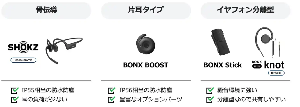 1. 「物理ボタン」で、迷わず、確実な入力を。 スマートフォンの画面ロックを解除してアプリを操作する手間は一切ありません。デバイスのボタンを押すだけのシンプルな操作体系により、介助の合間や移動の最中でも確実に「音声記録」を実施できます。 2. 「現場専用デバイス」であらゆる業務に対応 入浴介助中でも安心な防水性能(IP56)を備えたモデルや、長時間のシフトでも快適な軽量・ロングバッテリーモデルなど、現場のニーズに合わせたデバイス選択が可能です。現場の声を形にしてきたBONXならではの高精度な集音性能により、騒音下でも「あなたの声」だけをクリアに抽出し、安定した音声記録を実現します。 3. 「1台2役」で、導入・管理コストを最小限に。 チーム連絡用の「インカム」と、記録用の「入力デバイス」を別々に用意する必要はありません。1つのシステムで両方の役割を果たすため、デバイスの購入費用や、スタッフへの操作教育、日々の充電管理などの負担を大幅に削減します。 |
