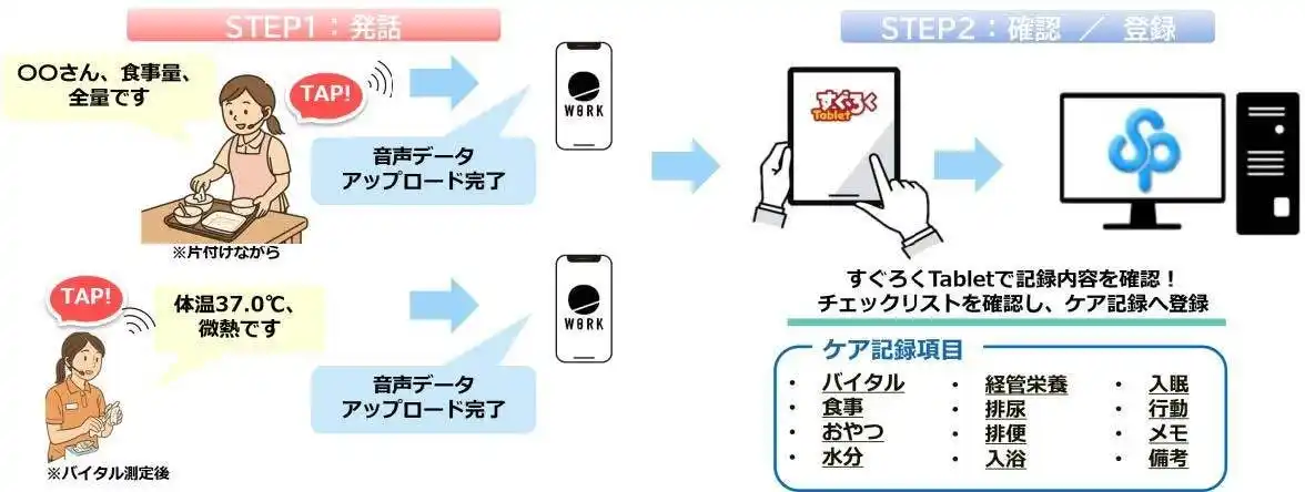 | 操作の流れは大きく分けて2ステップ。はじめにBONXデバイスを操作してケアの内容を発話します。続いて「すぐろく Tablet」のチェックリストで内容を確認して、転記ボタンを押すことでケア記録の登録が完了します。 | |||||||||