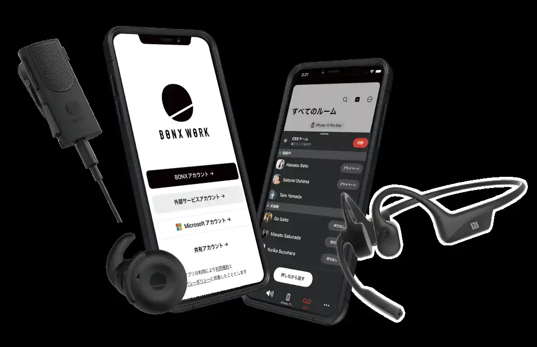 現場コミュニケーションのワンストップソリューション「BONX WORK」。1人1台のスマートフォンとイヤフォンさえあれば、グループトークや文字起こしなど、デスクレスワーカーの生産性を高める多彩な機能を即座に利用可能です。 https://bonx.co/work/ |
