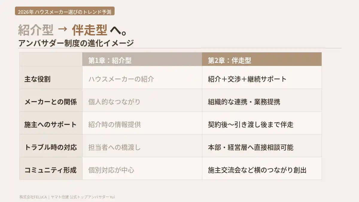 ハウスメーカーのアンバサダー制度は、「施主がメーカーを紹介する」という画期的な仕組みとして業界に定着しました。弊社は、この制度が今後さらに進化し、「紹介の先にある伴走型サポート」が消費者の新たな判断基準になっていくと考えています。 |