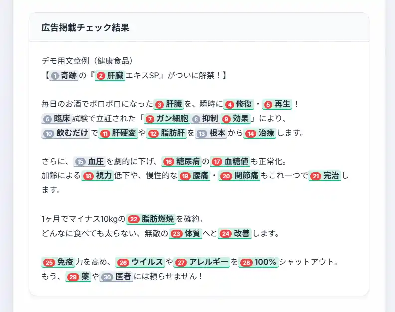 | 本ツールは最終判断を代替するものではなく、あくまで一次チェックを効率化するための支援ツールです。広告表現の最終的な適否は、文脈、画像との組み合わせ、媒体基準、法改正、行政判断などによって異なる場合があります。そのため、重要案件については専門家による最終確認を推奨しています。 | |||