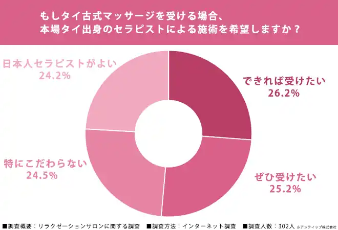 | また、タイ古式マッサージを受ける場合に本場タイ出身のセラピストによる施術を希望するか尋ねたところ、「ぜひ受けたい」が25.2%、「できれば受けたい」が26.2%となり、合わせて51.4%が希望すると回答しました。 | |||||
