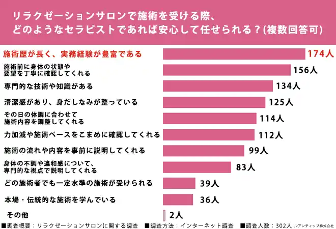 | 「リラクゼーションサロンで施術を受ける際、どのような施術者(セラピスト)であれば安心して任せられると感じますか?(複数回答可)」と質問したところ、「施術歴が長く、実務経験が豊富である」(174人)、「施術前に身体の状態や要望を丁寧に確認してくれる」(156人)、「専門的な技術や知識がある」(134人)という結果になりました。 | |||||