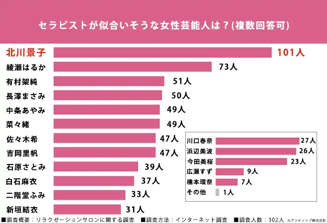 | 今回は、リラクゼーションサロンを利用したことがあるZ世代の302名を対象に「セラピストが似合いそうな女性芸能人ランキング調査」を実施しました。 | |||||