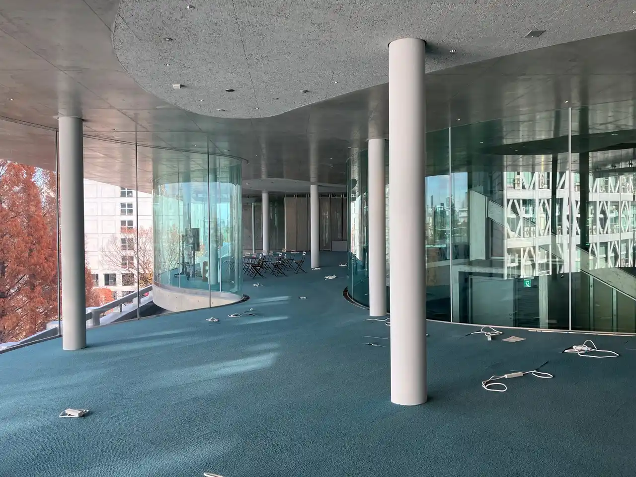 西早稲田キャンパス」は、2032年に早稲田大学創立150周年(理工創設125周年)を迎えるにあたって再整備を行っており、学生の多様な学びの場の拡充のため、より快適で機能的な空間づくりを推進しています。当社製品が採用されたのは、学生のアイデア創出を目的に新設されたフリースペース「ラーニングコモンズ」で、床に傾斜を設けることで、西早稲田キャンパスの緑豊かな中庭を望むことができるよう設計された、最大高低差500mmの傾斜がある3D曲面の床(※1)構造を持つ空間です。当社は、傾斜部には曲面の床にも浮き上がることなく敷設可能で、床下配線に対応する「ネットワークフロア40」を、平面部には軽量で加工性に優れた「クワッドフィックス600」を併用することで、機能性・安全性・歩行感の両立を図りました。 |