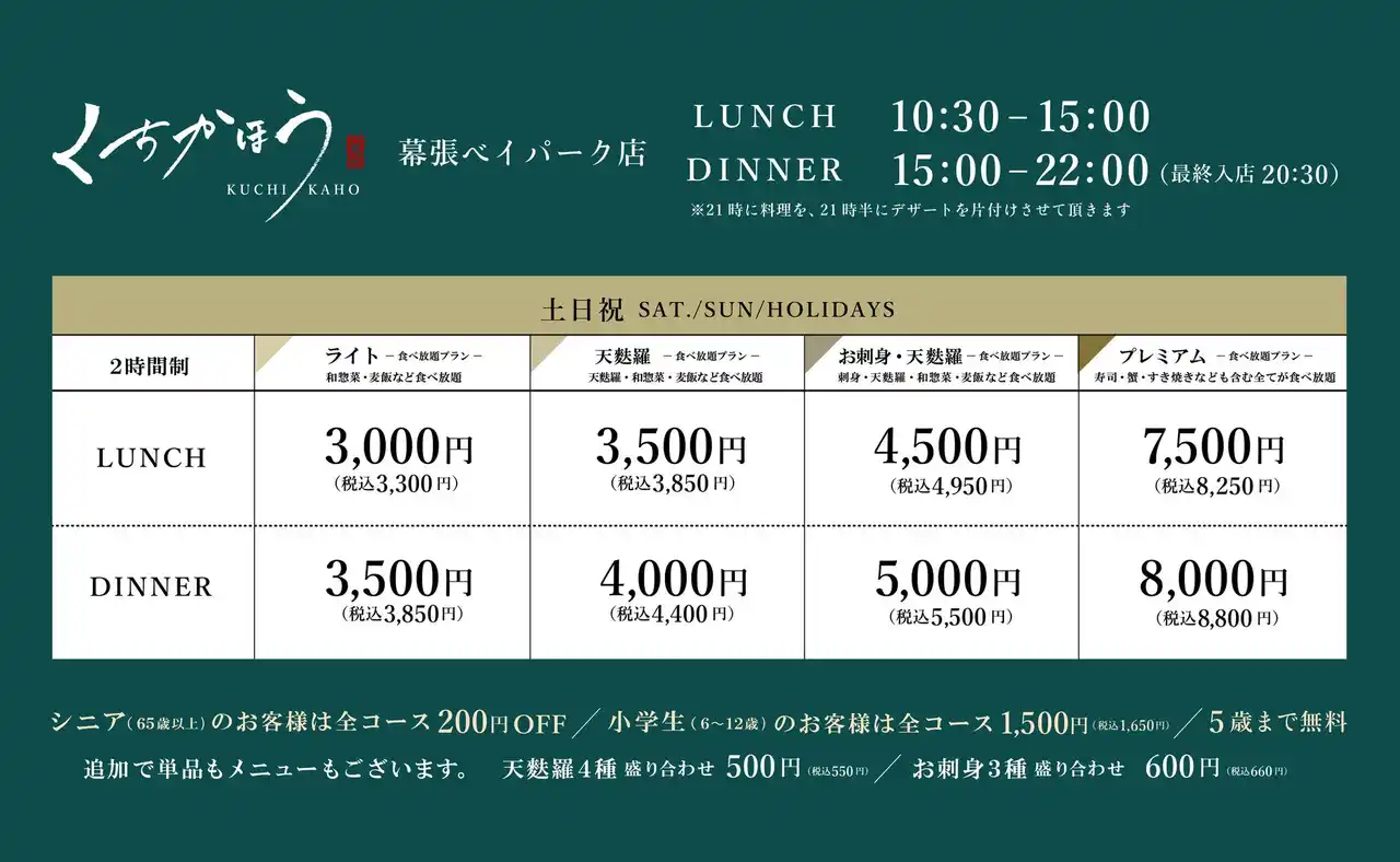 店舗名 :割烹ビュッフェレストラン『くちかほう 幕張ベイパーク』 所在地 :千葉県千葉市美浜区若葉3-1-42 幕張ベイパーク ライズガーデン1F 電話 : 043-307-3733 営業時間:【ランチ】 10:30~15:00 【ディナー】 15:00~22:00 |