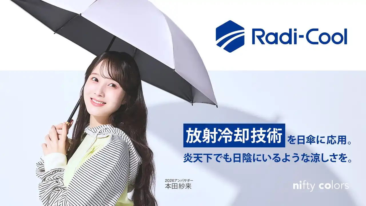 株式会社ニフティカラーズ(本社:東京都墨田区)は、応援購入サービス「Makuake」で2月に目標金額1,765%を達成した放射冷却素材「Radi-Cool」採用の晴雨兼用シリーズを展開しています。 当プロジェクトでは「オートマティック耐風ミニ58」が268人のサポーターから総額1,765,590円の応援購入を集めました。 また、炎天下30分間の照射試験において頭部表面温度の上昇を最大−37.1℃抑制する結果を確認し高い遮熱効果があることを実証しています。 2026アンバサダーには、モデルとしてご活躍されている本田紗来さんを起用しています。 |
