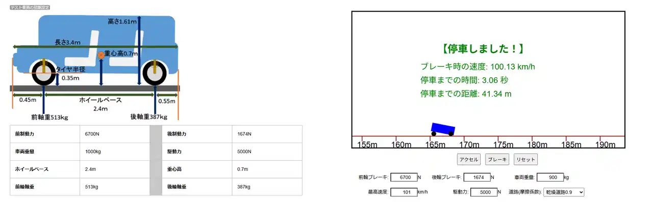 Planck.jsを用い、車の重量・駆動力・路面状態などを反映。制動力は車検で検査した前後の制動力を入力して「右に走行する車がブレーキを踏んでから止まるまでの距離と時間」を再現します。 |