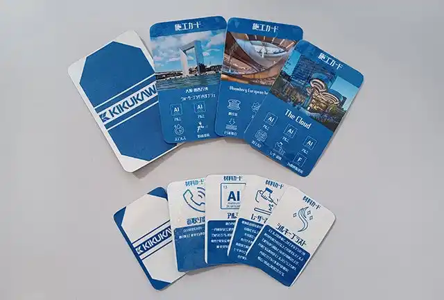 菊川の施工事例と技術をもとに考案されたオリジナルカードゲーム。内定者や新入社員を対象とする研修等で、楽しみながら自社の施工事例を学ぶのに役立つ。 |