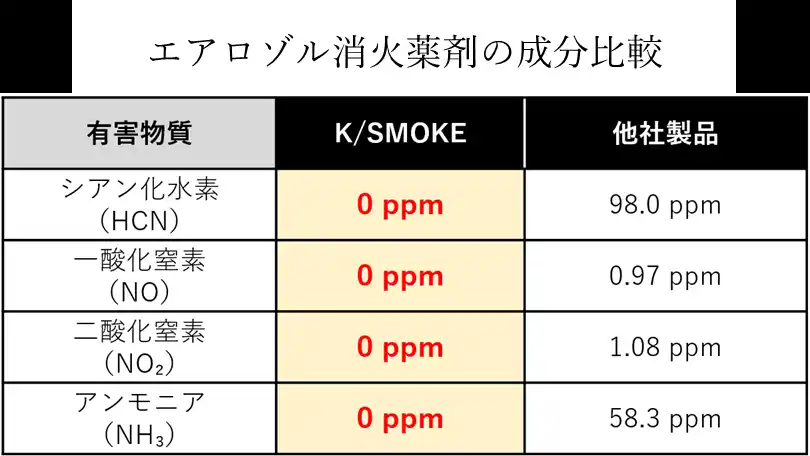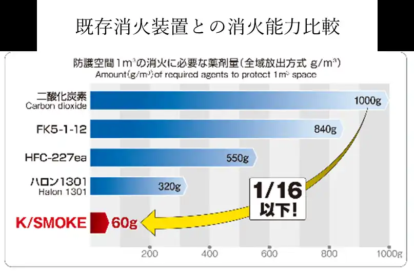 しかし、誤放出による死亡事故、高い環境負荷といった課題が指摘されており、安全性の高い代替技術が求められてきました。その中で、「K/SMOKE GAS」は有害ガスを一切発生させず人体安全性が高いことに加え、地球温暖化係数・オゾン破壊係数もゼロという優れた環境性能、そして高い消火能力を同時に満たす、国内初のエアロゾルガス消火設備として開発されました。 |