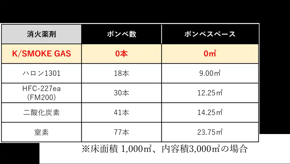 「K/SMOKE GAS」は、人体安全性に配慮した薬剤を用い、地球温暖化係数(GWP)およびオゾン破壊係数(ODP)がともにゼロで、ボンベや配管を要しない設計により、施工や保守の負担軽減も期待されます。 |