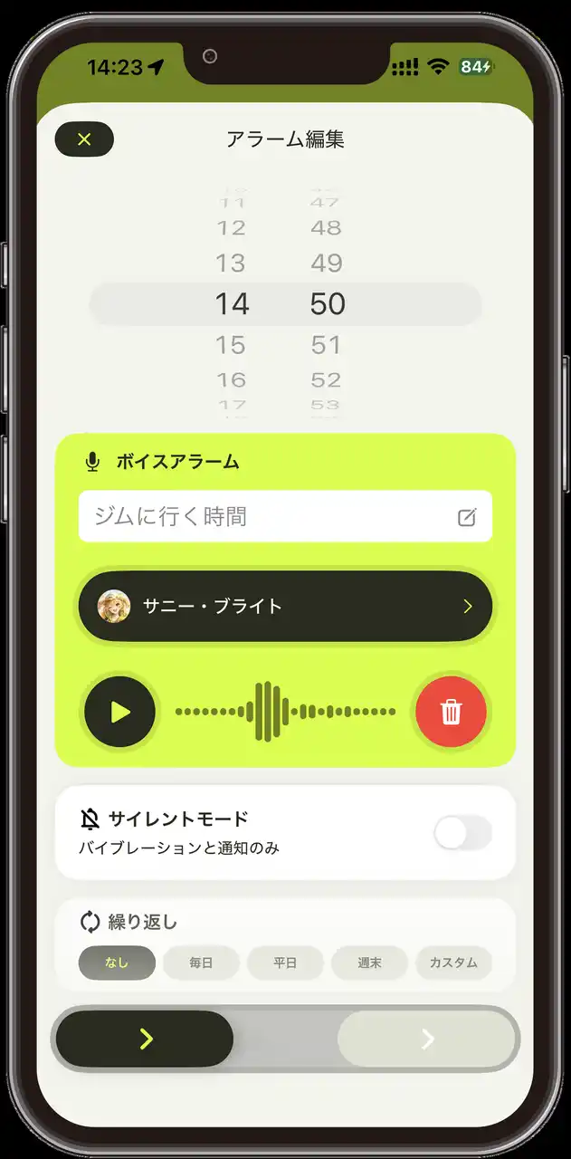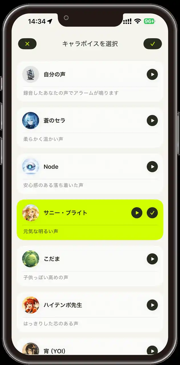 オープンソースの音声合成ソフトウェア「VOICEVOX」と連携し、テキストを入力するだけでキャラクターの声によるアラームを作成できます。自分の声を録音するのに抵抗がある方や、楽しくアラームを使いたい方にも最適です。 |
