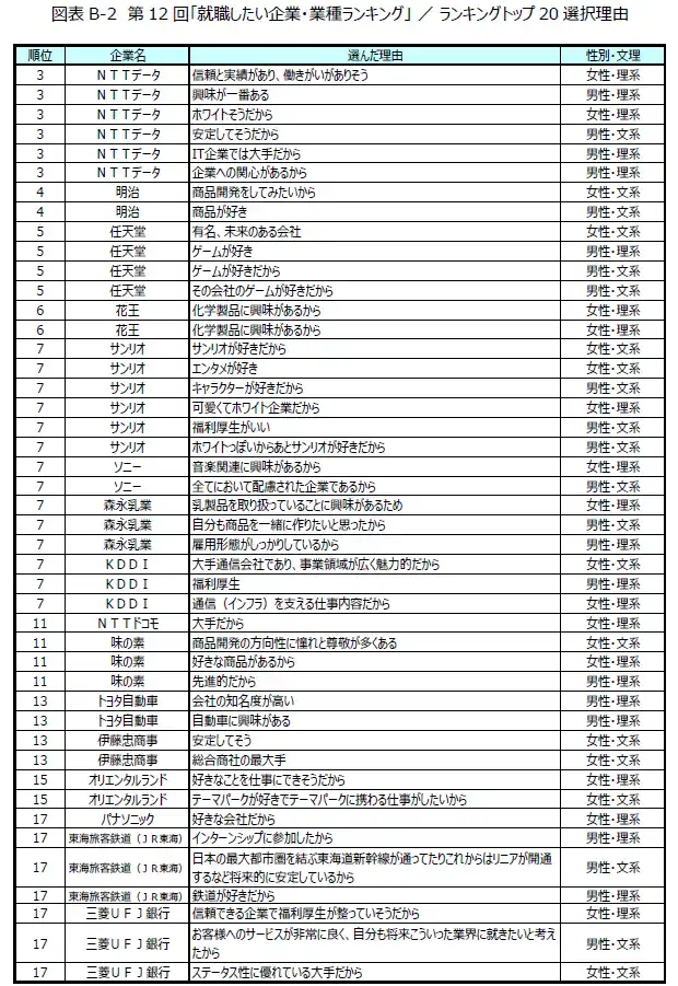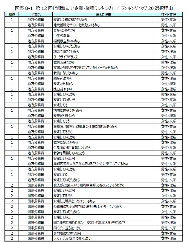 トップ20では、食料品製造や電気機械器具製造、玩具などの製造業が複数ランクインし、生活に身近な企業が支持される傾向がみられます。文理別では公務員が上位を占め、民間企業では「任天堂」と「KDDI」の2社が文系・理系ともにランクインしました。 |