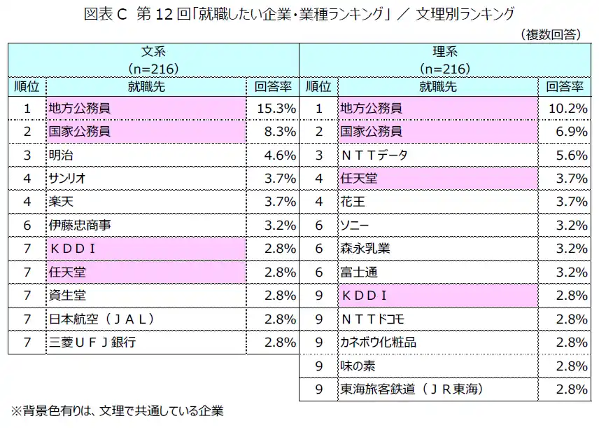 就職したい企業を文系・理系別に集計したところ、前回調査から引き続き、文系・理系ともに「地方公務員」、「国家公務員」がトップ2を占めました。文系と理系の両方にランクインした企業は「任天堂」と「KDDI」の2社でした。 |