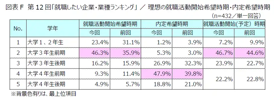 理想の就職活動開始時期について調査したところ、理想(希望)の開始時期と実際の開始時期がともに「大学3年生前期」(回答率 理想46.3%、実際46.7%)が最多となり、3年進級時に集中しています。また、理想の内定希望時期は「大学4年生前期」(同47.9%)が最多となり、大学3年生後期までに内定を獲得したい学生(合計回答率33.4%)と合わせると、8割以上が大学4年生前期までに就職活動を終了させたいと考えていることが明らかとなりました。(図表F) |
