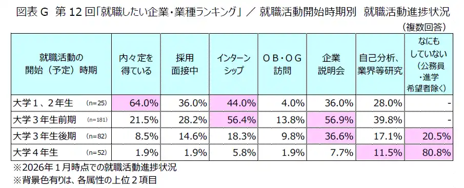 さらに、就職活動開始時期ごとの就職活動進捗状況を調査したところ、「大学1,2年生」開始の6割以上、および「大学3年生前期」開始の約2割が「内々定を得ている」など進捗度が高いのに対して、「大学3年生後期」開始や「大学4年生」開始では、「企業説明会」や「自己分析、業界等研究」に留まっている様子がうかがえます。(図表G) |