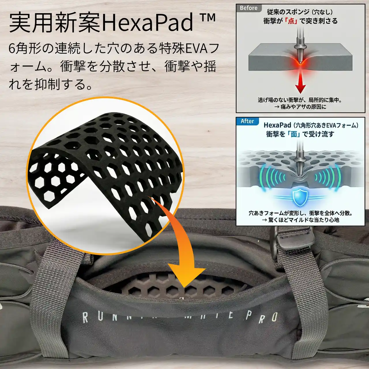 3)衝撃を吸収し腰を守る実用新案「HexaPad(TM)︎」: 独自の6角形の連続する穴をもつ薄いパッドが衝撃を吸収。スマートフォンやポール、補給食への振動を軽減する。 |