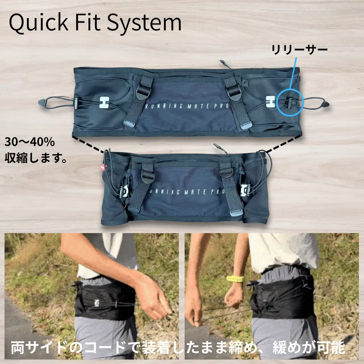 1)フィット感を瞬間調整「Quick Fit System」:体型や荷物の量に合わせてコードで締め付け具合を調整でき、長距離走行でもズレを抑える。走りながらの微調整も可能。 |