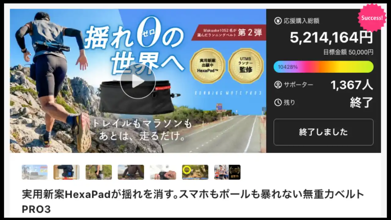 株式会社TEAM ONE DAY(本社:東京都港区、代表取締役:大村竜助)は、実用新案技術「HexaPad(TM)︎」を搭載したランニングベルト『Running Mate PRO3』のアンコールプロジェクトを、2026年3月20日(金・祝)よりMakuakeにて開始いたしました。 開始3日間で支援者150名、支援額約60万円を達成。前回のプロジェクトと合わせ、累計1,500名を超えるランナーの皆様に、一般販売前の先行予約販売という形でご支持をいただいております。 |