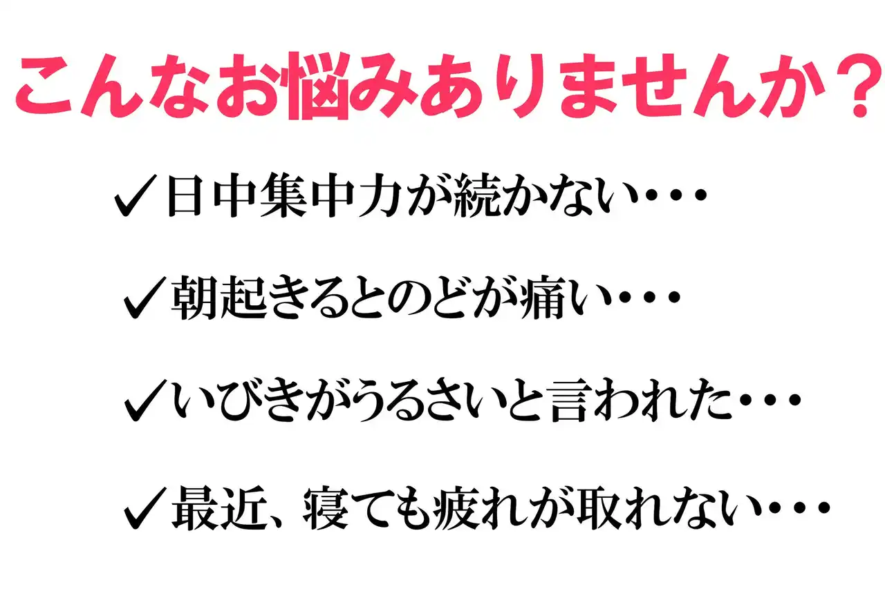 | もしかすると、そのお悩みは睡眠中の呼吸の乱れが関係している可能性があります。昼間の強い眠気や集中力の低下、朝起きても疲れが取れないといった状態は、生活の質(QOL)にも影響します。しかし、恥ずかしさや対処法がわからず悩んでいる方も少なくありません。 | |||||||||||||||