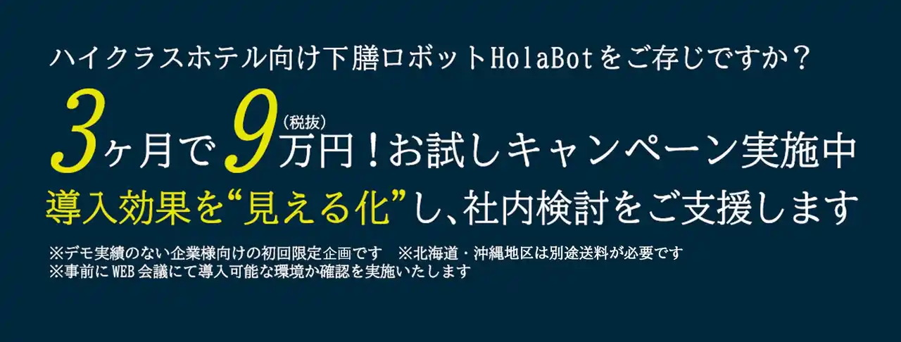 下げ膳ロボット「HolaBot」を実際の現場で3か月間、お試しいただけます。 実際の環境で検証を行い、導入効果が体感できます。 |