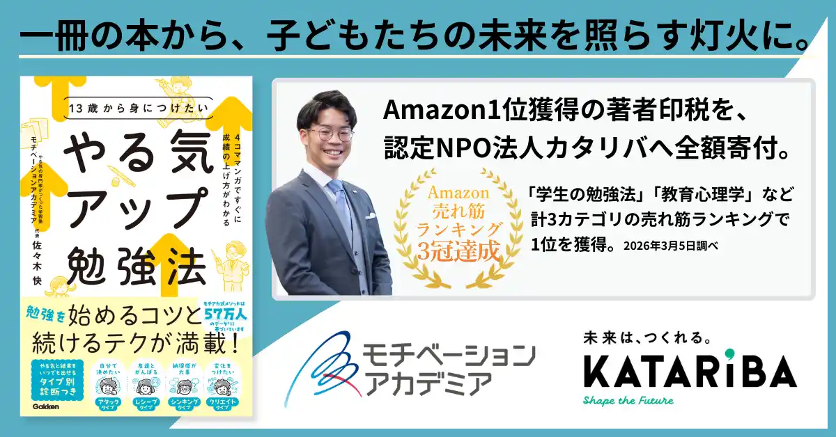 中高生向け個別指導塾「モチベーションアカデミア」(https://m-academia-s.com/)を運営する株式会社リンクアンドモチベーション(本社:東京都中央区、代表:小笹芳央、証券コード:2170)のグループ会社である株式会社モチベーションアカデミア(本社:東京都中央区、代表:佐々木快)は、2026年3月5日に発売し、Amazon売れ筋ランキング3カテゴリで1位を獲得した新刊『13歳から身につけたい やる気アップ勉強法』(Gakken)の著者印税の全額を、認定特定非営利活動法人カタリバ(本部:東京都中野区、代表理事:今村久美、以下「認定NPO法人カタリバ」)へ寄付することをお知らせいたします。 |