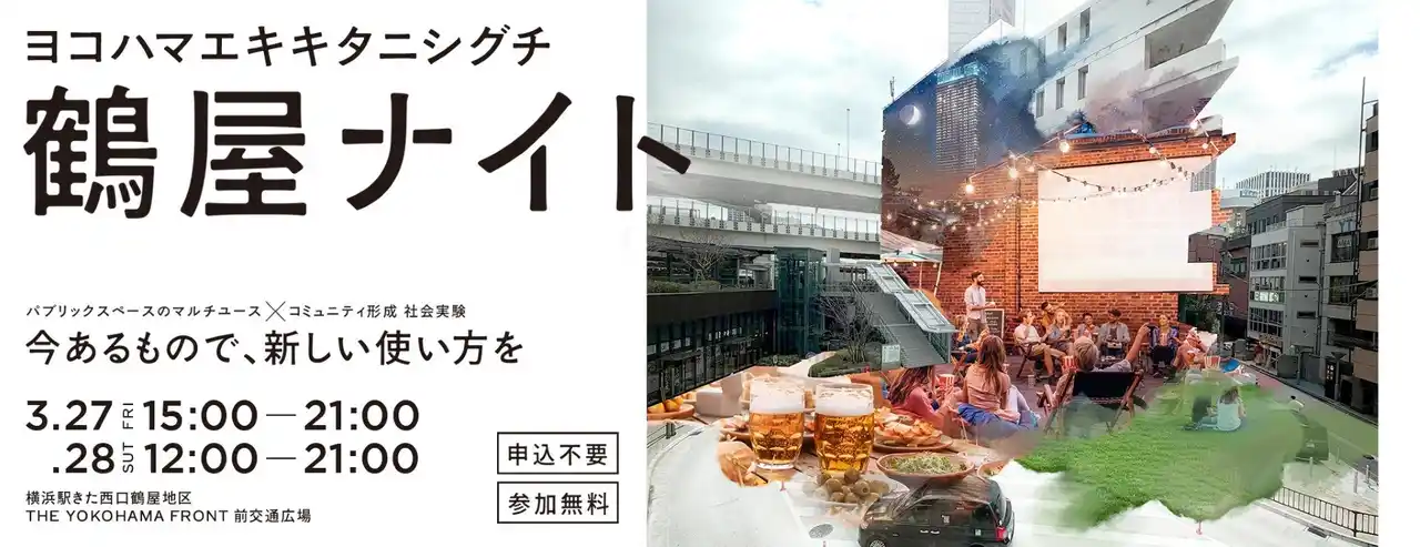 | 横浜駅きた西口エリアに位置する鶴屋地区でのコミュニティ形成を図ること鶴屋町エリアの交通広場や道路空間などのパブリックスペースをマルチユースに活用していくこと鶴屋町の魅力である「食」と、新たなコンテンツとして「映画(アート)」を軸に、鶴屋町に新たな来訪者を誘引し、回遊を促すこと | |||