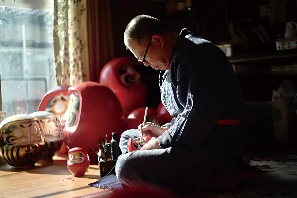 竹内だるま店は1937年の創業以来、日本有数のだるま産地である高崎の地で、伝統的な技法を守りながらだるまづくりを続けてきた工房です。三代目の竹内邦次氏は、受け継がれてきた技術に現代の感性を融合させ、伝統を次の世代へつなぐ取り組みを行っています。 |