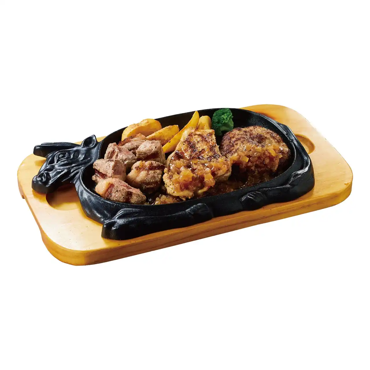 「3月の29(肉)の日」の限定メニューとして登場する「アンガスサーロインカットステーキのトリプルグリル」は、やわらかい赤身に適度なサシが入ったブラックアンガス牛のサーロインカット(120g)をはじめ、直火で皮目をパリッと焼き上げた香ばしいグリルチキン(100g)、ジューシーな手ごねハンバーグ(100g)を一度に楽しめる、満足感たっぷりの商品です。お好みで国産わさびやガーリックチップとご一緒にお召し上がりください。 |