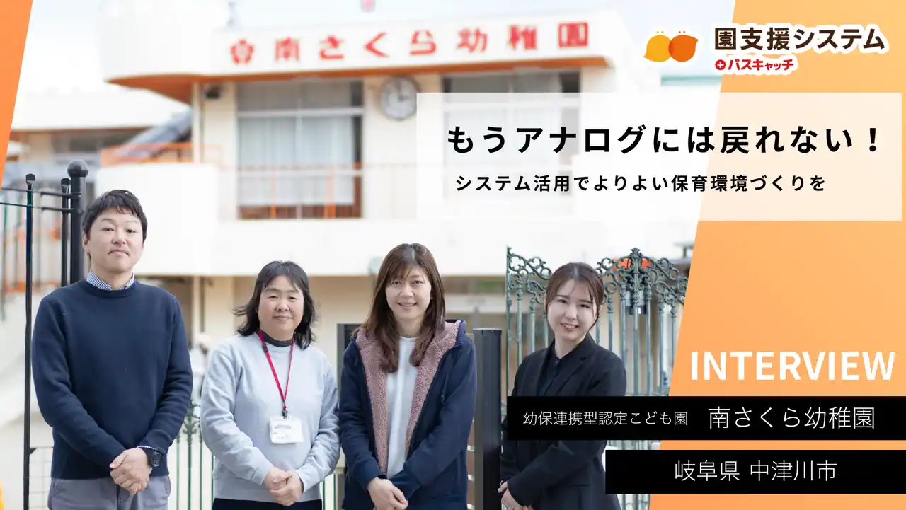 幼保連携型認定こども園 南さくら幼稚園(所在地:岐阜県中津川市、園長:馬場 啓子先生)は、2024年6月よりVISH株式会社の「園支援システム+バスキャッチ」を導入。ICT化前の課題と、システムの導入効果について、南さくら幼稚園の担当者に取材した導入事例記事を公開しました。 |