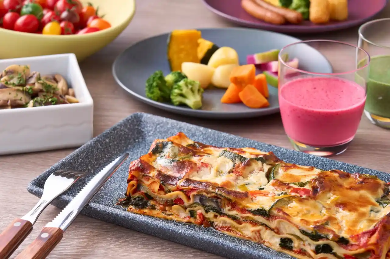ベジタブルラザニアや温野菜、スムージーなど、ベジタブルメニューも豊富 |