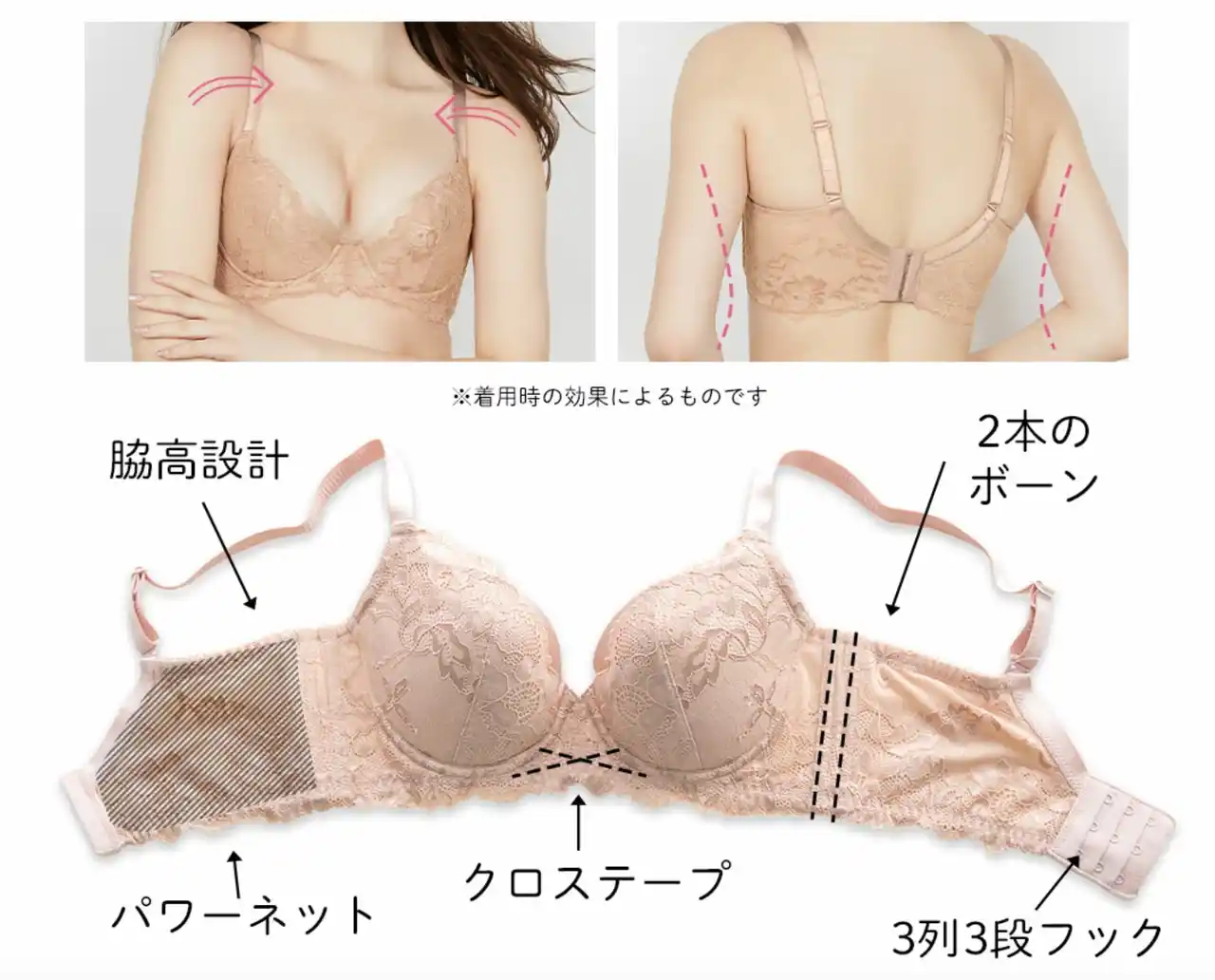 | とくに加齢や授乳とともに柔らかくなり、流れてしまいやすくなったお肉をしっかりと集め、バストを高い位置でキープする習慣をつけてくれる「元祖脇肉キャッチャー 」。その特徴は以下の4点となります。 | |||