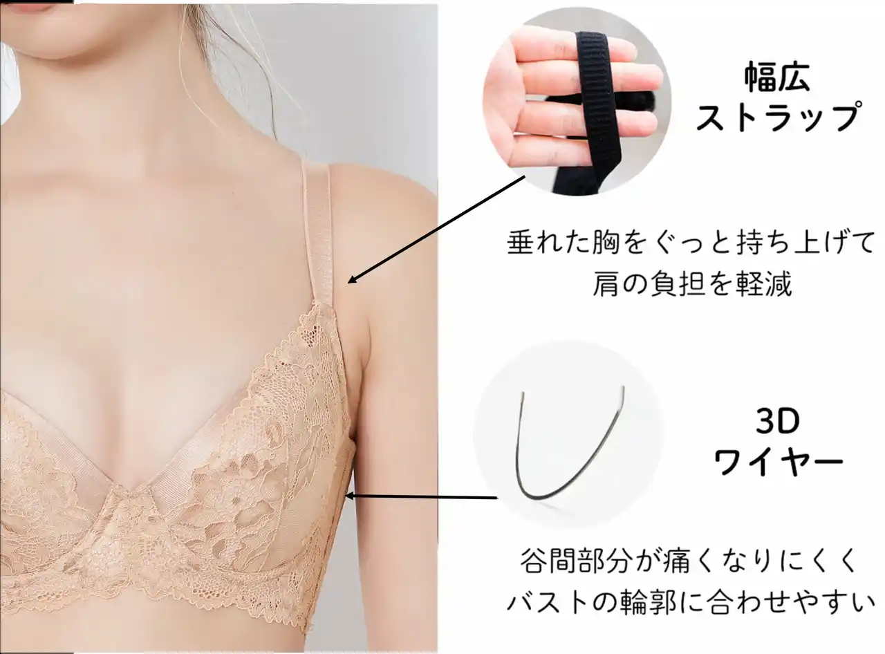 | さらに、HEAVEN Japanが独自に開発した「3Dワイヤー」がバストの輪郭に優しくフィット。谷間部分にワイヤーが当たりにくく、着用中に痛みを感じることがありません。また幅広のストラップでバストをぐっと持ち上げることで、痛くなったり凝りやすい肩の負担も軽減されるように工夫しています。 | |||