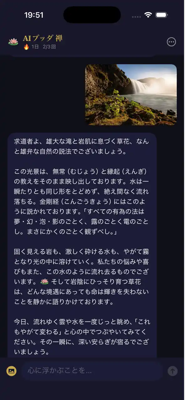 テキストでの悩み相談に加え、写真を送ると画像の内容をAIが読み取り、仏教の教えと結びつけて応答する機能も搭載しています。 |