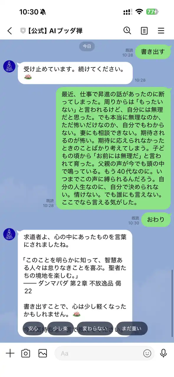 「おわり」と送ると、書き出された内容全体をRAGで分析し、最もふさわしい経典の偈句を一つだけ選んでお伝えします。「書き出すことで、心は少し軽くなったかもしれません」という言葉とともに、今の気持ちを「安心」「少し楽」「変わらない」「まだ重い」の4段階で記録する機能も提供します。 |