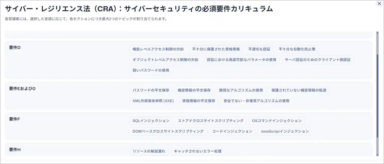 このたび、Secure Code Warriorは、CRAで求められる広範なセキュリティ要件に対応するための学習コンテンツを追加しました。これにより、ソフトウェア開発ライフサイクル(SDLC)全体でのセキュリティを確保するための実践的なスキルを、開発チーム全体で体系的に習得することが可能になります。 Secure Code Warriorでは、動画やテキストよる解説に加え、実践的なセキュリティレビューや脆弱性修正の演習を提供します。「設計段階でのセキュリティ確保」の概念と、CRAが重視する「優先度の高い脆弱性トピック」を組み合わせた体系的なカリキュラムにより、法規制に準拠したセキュアな開発体制の構築を強力に支援します。 |