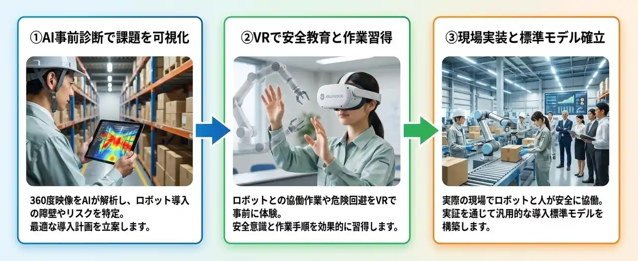 本プロジェクトでは、単なる一企業のロボット導入にとどまらず、「事前のAI診断とVR教育を組み込めば、どんな現場でも安全かつ確実にロボットが定着する」という業界全体のベストプラクティス(標準モデル)を、国の大型予算を活用して実証していきます。 |