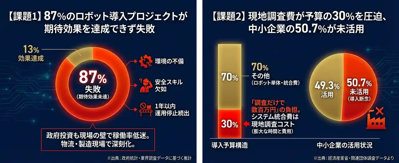 従来のロボット導入では現地調査・環境測定・安全教育に膨大な時間とコストがかかり、導入検討段階で断念する企業が急増。特に地方の中小製造業では「調査だけで数百万円」という負担が自動化推進の最大の障壁となっている。 |